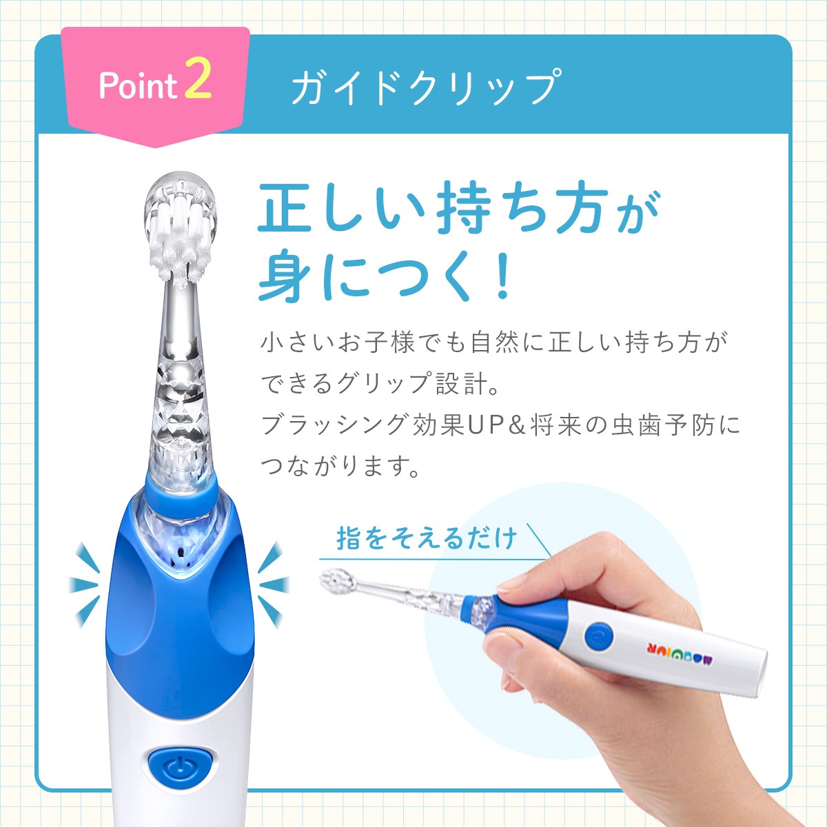 ガイドグリップ付きで握りやすく、お子さまが自分で歯磨きできるサポートをします。