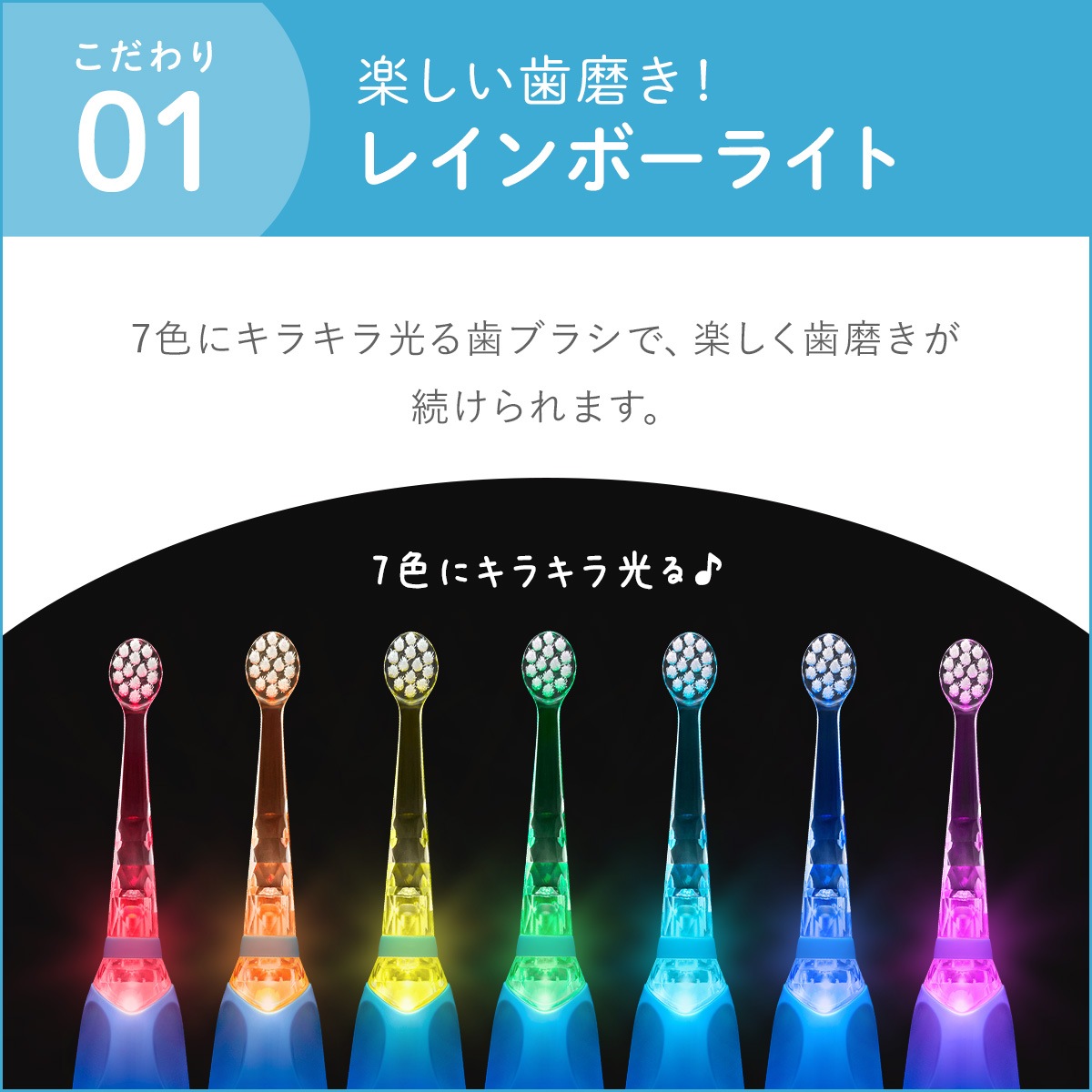 レインボーライトに光る歯ブラシで、歯磨きが楽しくなります。