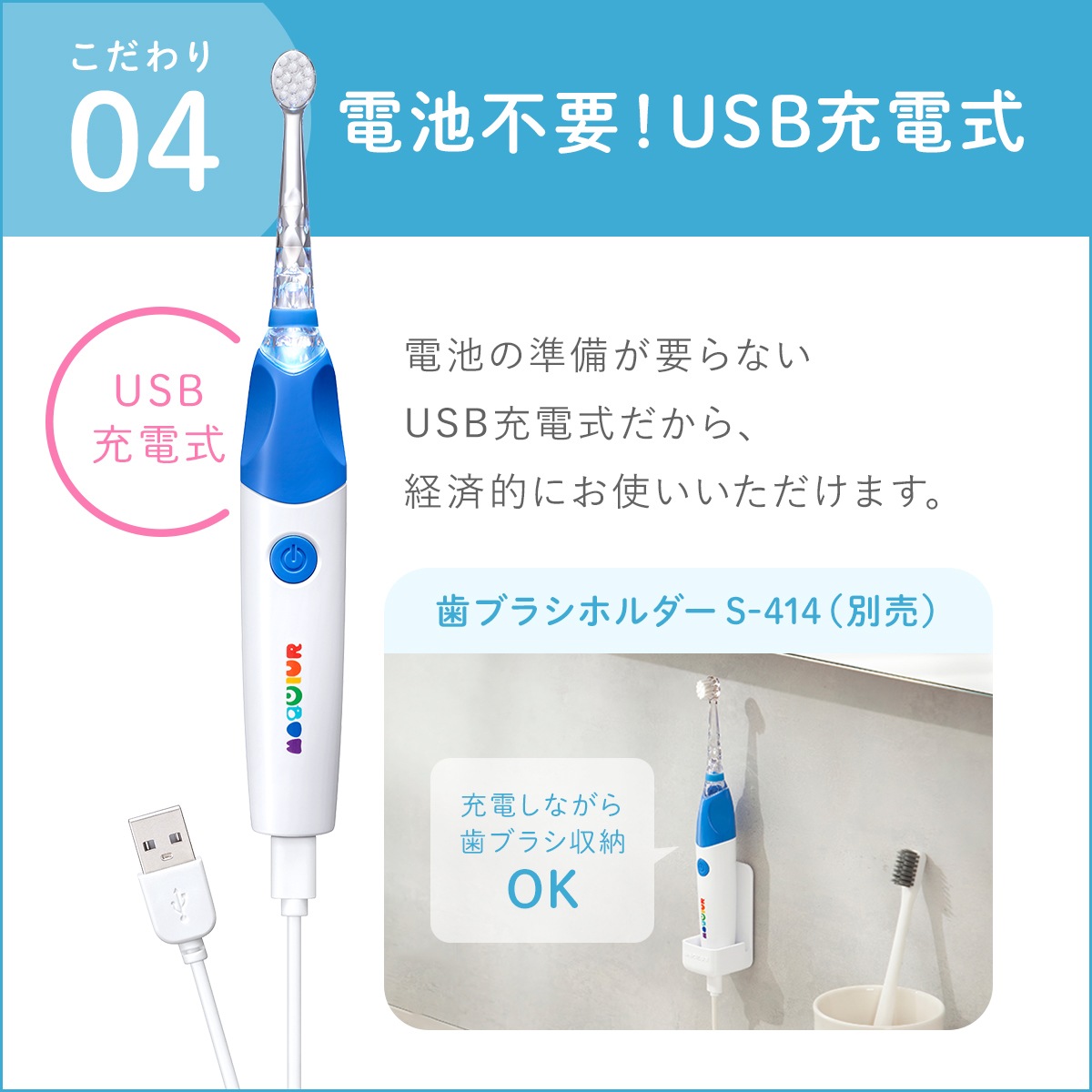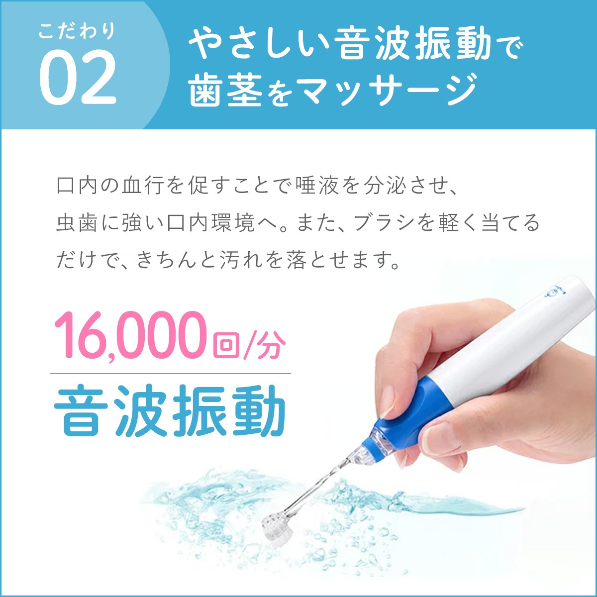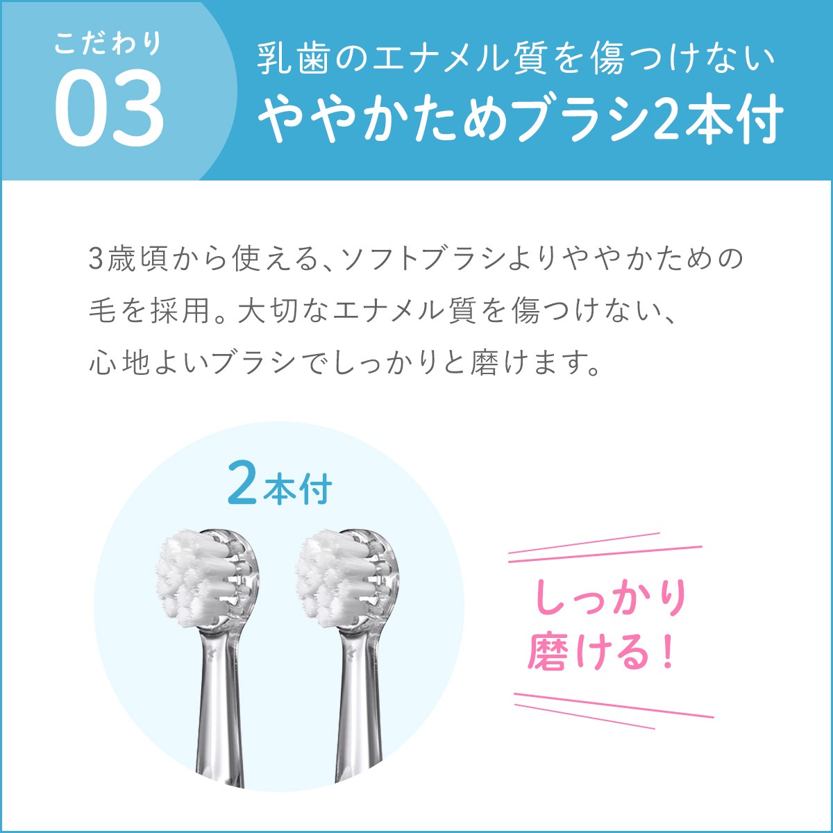 やさしい音波振動で、乳歯をしっかりと磨けるので、歯の健康も守れます。