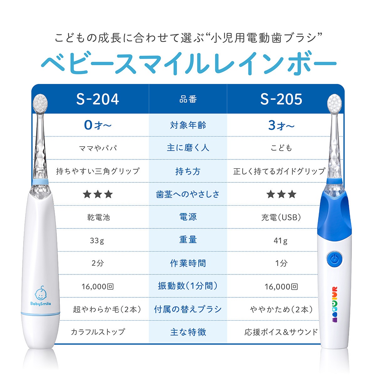 ベビースマイルレインボー3+ S-205 虹色に光るこども用 音波電動歯ブラシ