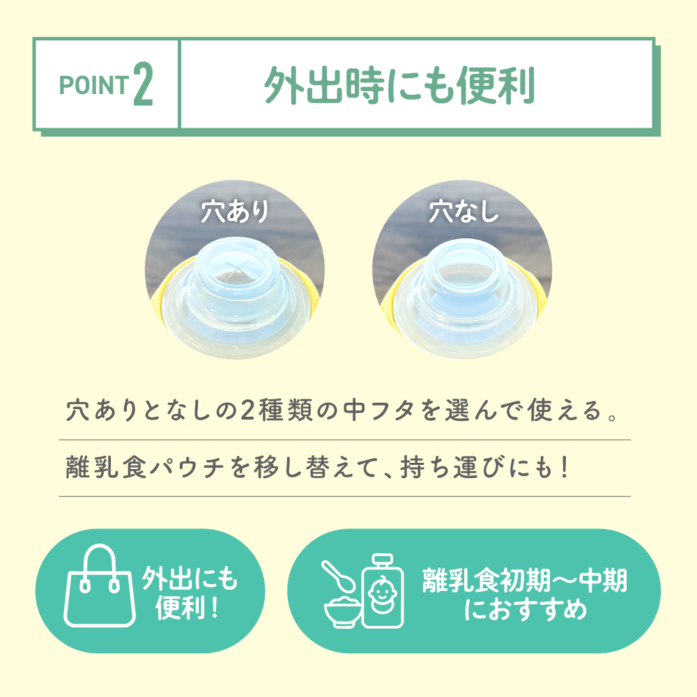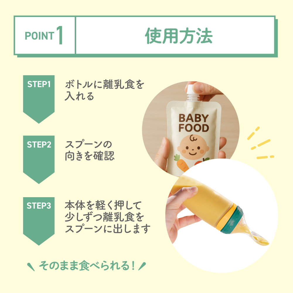 ボトルに離乳食を入れ、スプーンの向きを確認し、本体を軽く押して少しずつ離乳食をスプーンに出します。