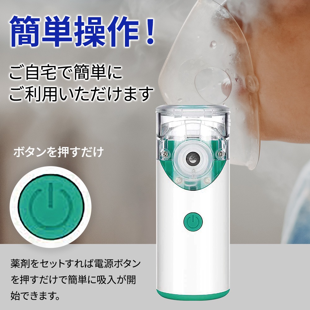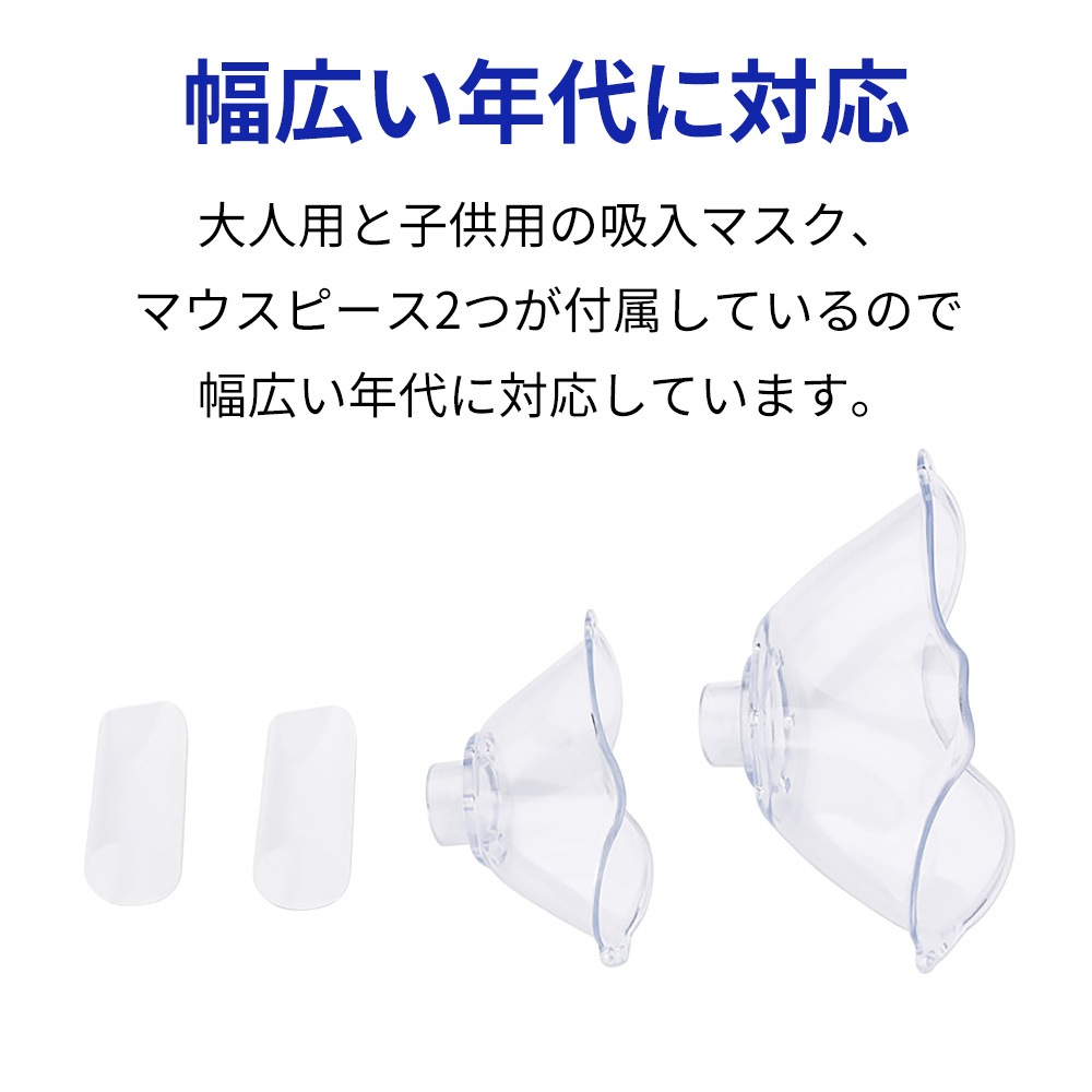 USB充電ケーブル(約50cm、Micro USB Type B)・薬液カップ ・吸入マスク(大人用) ・吸入マスク(子供用) ・マウスピース×2 ・メッシュカバー