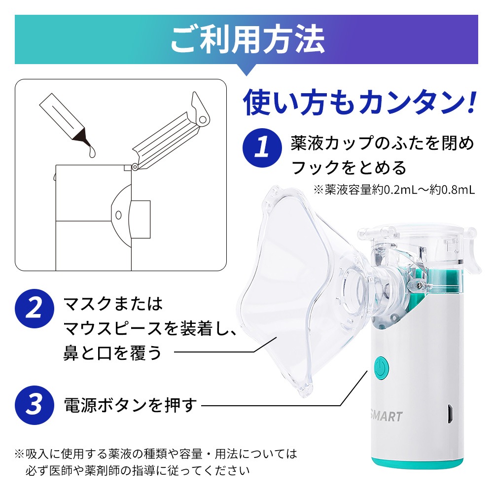 ※ご使用の前に、薬液の種類をよくご確認ください。超音波メッシュ式ネブライザーに適さない薬液は使用しないでください。