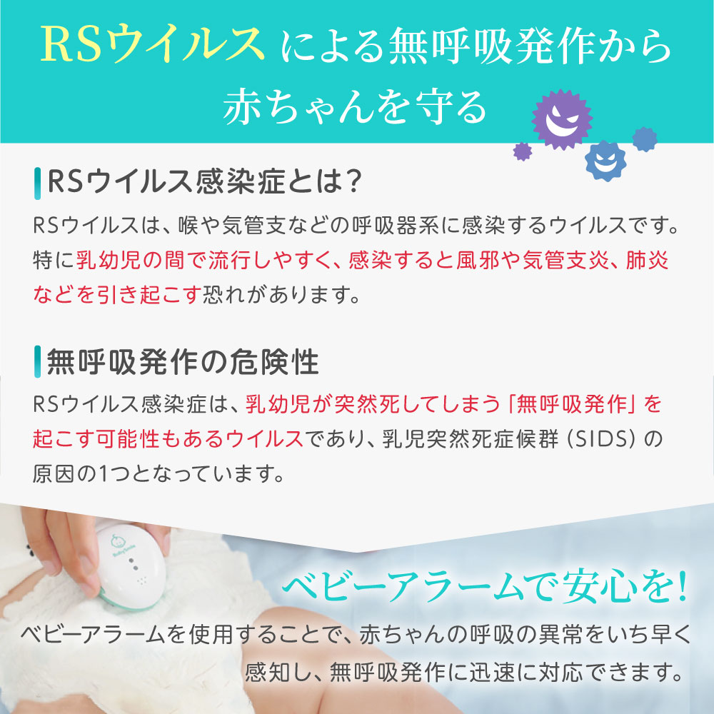 ※ベビーアラームは乳幼児突然死症候群(SIDS) の予防や睡眠障害(睡眠時無呼吸等)の病気の評価に 用いる機器ではありません。